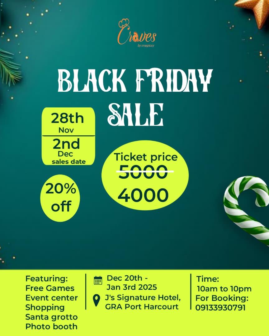 The biggest festive celebration in Port Harcourt just dropped its biggest discount of the year! From November 28th to December 2nd, enjoy 20% OFF tickets to the Christmas Village Gingerbread House Party 2025 — hosted by Craves by Evaspice at J’s Signature Hotel.
