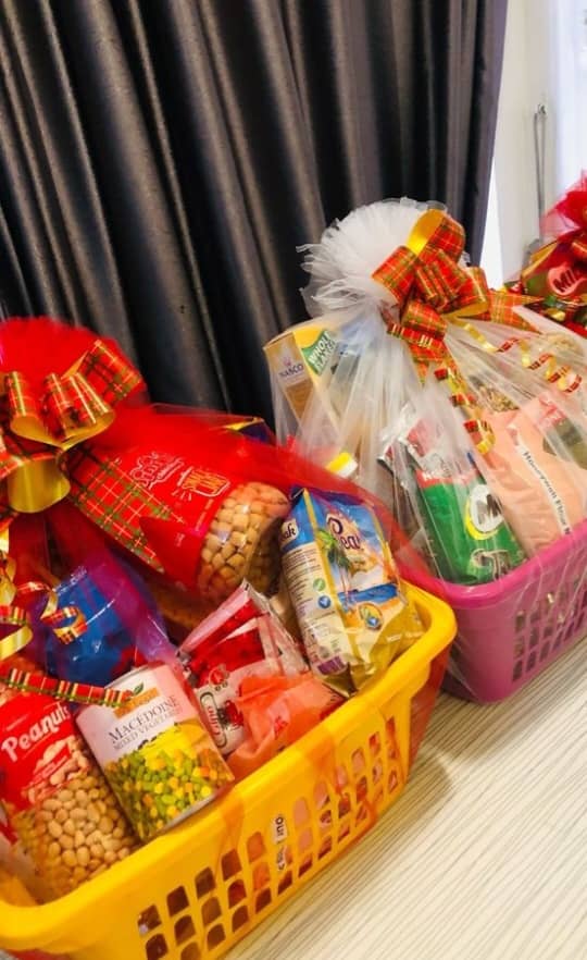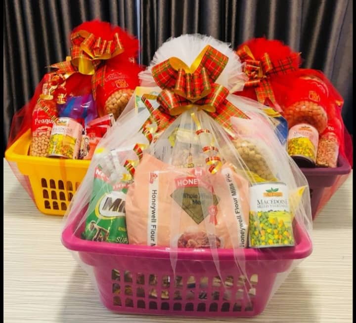 PACKAGE 2: GiftHub Family Comfort Bundle Hamper : Containing the christmas gifting essentials of Medium Dano milk, Medium Milo, Honey or Cornflakes, Semolina, Garri, WheatOats, Pasta + Tomato mix, Spices / seasonings, Groundnuts / snacks, Beautiful large basket wrapping and ribbon